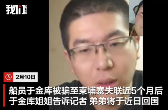 2月10日凯时体育游戏app平台,船员于金库被骗至柬埔寨失联近5个月后,于金库姐姐告诉记者,弟弟将于近日坐大使馆包机归国。
