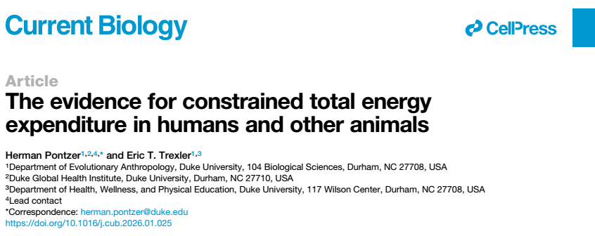 [1]Pontzer H, Trexler ET. The evidence for constrained total energy expenditure in humans and other animals. Curr Biol. 2026 Feb 6:S0960-9822(26)00064-3. doi: 10.1016/j.cub.2026.01.025. Epub ahead of print. PMID: 41653928.
